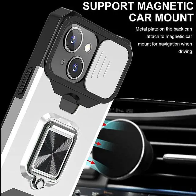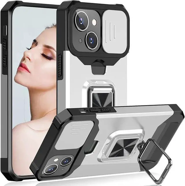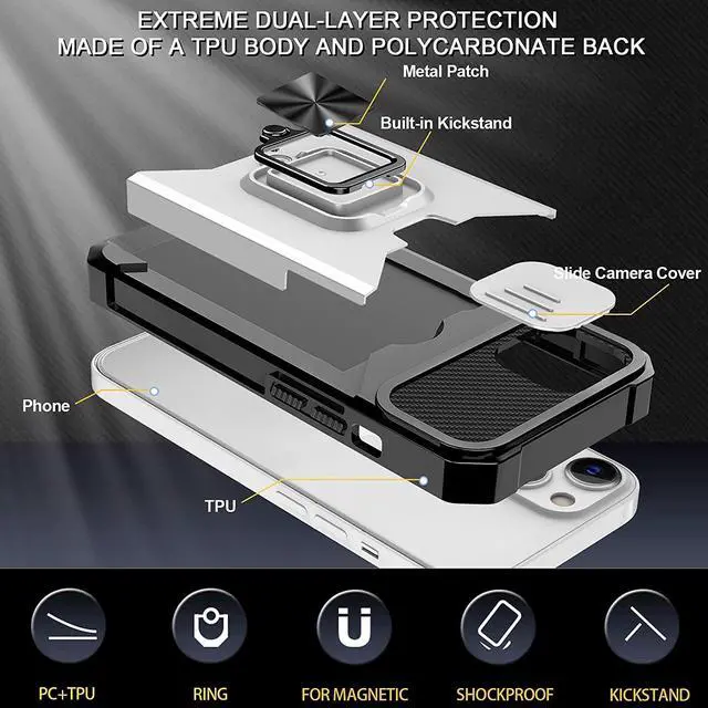 Features: Compatible with Apple iPhone 14. Military Standard Shock Test MIL-STD 810G- 516.6 Protection. The case endured 26 drops (at 48in) on all 6 faces, 12 edges and 8 corners of the device and sustained zero damage to the appearance and internal hardware of the phone itself. Stylish, minimalist protection for your smartphone. Crafted from anti-scratch TPU and a super strong polycarbonate frame, the case protects your device while complimenting its sleek aesthetics. Reinforced corners are designed to deflect shock force away from your phone and the corners are the most vulnerable areas of any phone or case. The back of the case has a built-in extremely practical handle, Ring, which can be put on the finger to hold the phone more securely in your hand. It also allows you to attach the phone to a magnetic car holder. Flip the ring out and it doubles as a kickstand to take your binge-watching experience to the next level. With this case, you can leave your wallet at home thanks to the credit card slot featured on the case. Privacy cover slides in front of camera when not in use.