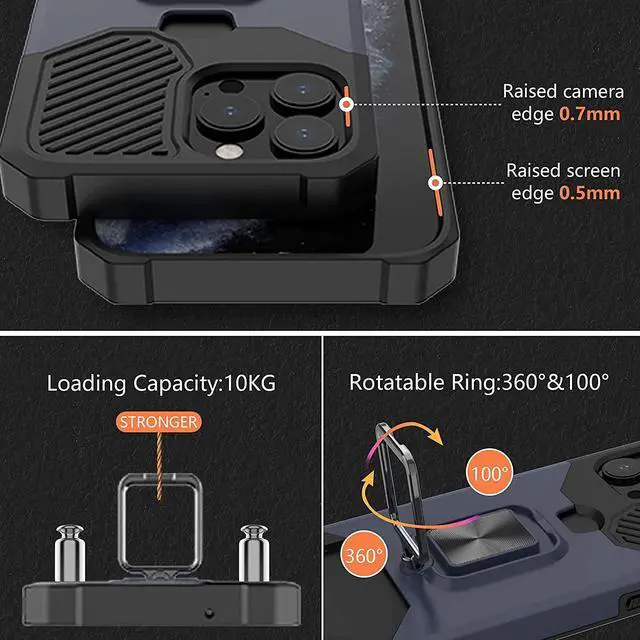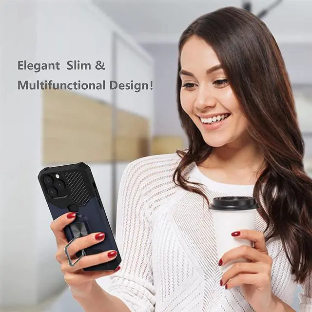 Features: Compatible with Apple iPhone 14 Pro Max. Military Standard Shock Test MIL-STD 810G- 516.6 Protection. The case endured 26 drops (at 48in) on all 6 faces, 12 edges and 8 corners of the device and sustained zero damage to the appearance and internal hardware of the phone itself. Stylish, minimalist protection for your smartphone. Crafted from anti-scratch TPU and a super strong polycarbonate frame, the case protects your device while complimenting its sleek aesthetics. Reinforced corners are designed to deflect shock force away from your phone and the corners are the most vulnerable areas of any phone or case. The back of the case has a built-in extremely practical handle, Ring, which can be put on the finger to hold the phone more securely in your hand. It also allows you to attach the phone to a magnetic car holder. Flip the ring out and it doubles as a kickstand to take your binge-watching experience to the next level. With this case, you can leave your wallet at home thanks to the credit card slot featured on the case. Privacy cover slides in front of camera when not in use.