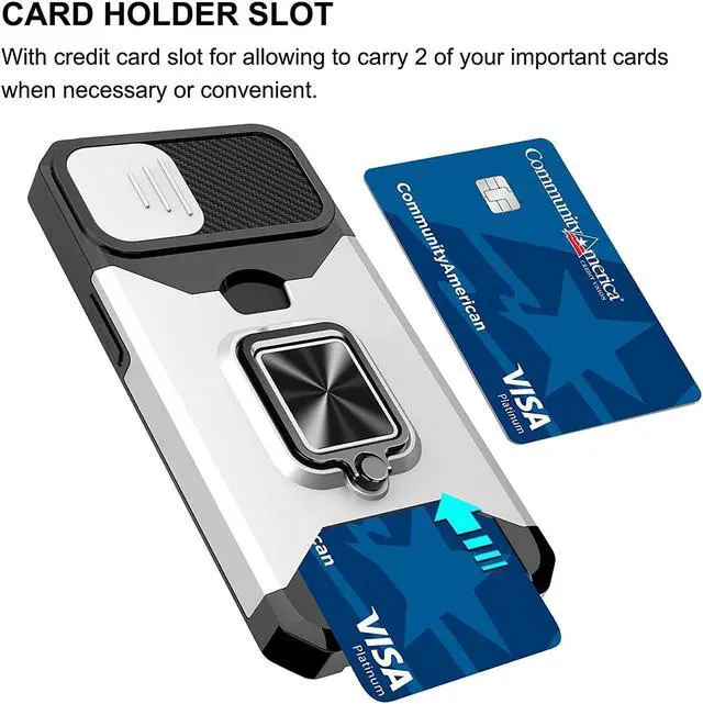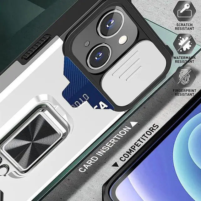 Features: Compatible with Apple iPhone 14 Plus. Military Standard Shock Test MIL-STD 810G- 516.6 Protection. The case endured 26 drops (at 48in) on all 6 faces, 12 edges and 8 corners of the device and sustained zero damage to the appearance and internal hardware of the phone itself. Stylish, minimalist protection for your smartphone. Crafted from anti-scratch TPU and a super strong polycarbonate frame, the case protects your device while complimenting its sleek aesthetics. Reinforced corners are designed to deflect shock force away from your phone and the corners are the most vulnerable areas of any phone or case. The back of the case has a built-in extremely practical handle, Ring, which can be put on the finger to hold the phone more securely in your hand. It also allows you to attach the phone to a magnetic car holder. Flip the ring out and it doubles as a kickstand to take your binge-watching experience to the next level. With this case, you can leave your wallet at home thanks to the credit card slot featured on the case. Privacy cover slides in front of camera when not in use.