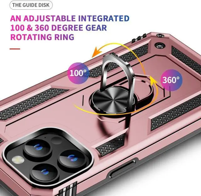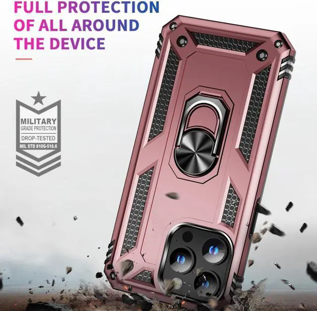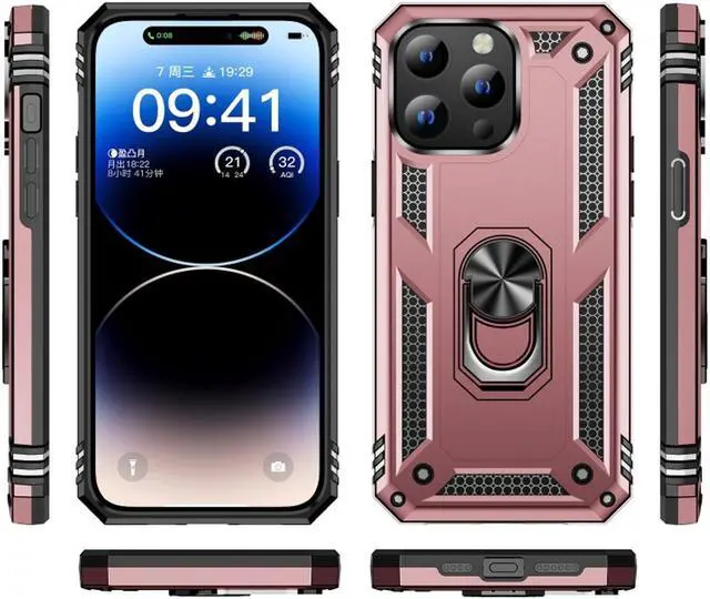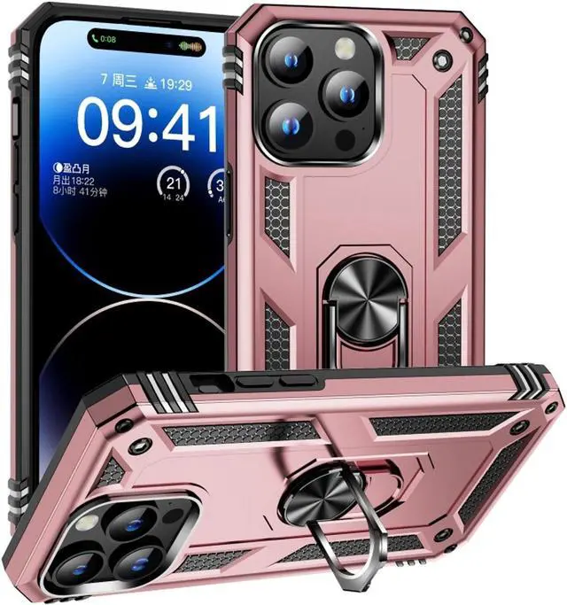 Features: Compatible with Apple iPhone 15 Pro Max. Military Standard Shock Test MIL-STD 810G- 516.6 Protection. The case endured 26 drops (at 48in) on all 6 faces, 12 edges and 8 corners of the device and sustained zero damage to the appearance and internal hardware of the phone itself. Made from a special strong and lightweight durable material, providing you with long lasting protection for your smartphone without making it cumbersome. Ring holder for extra drop protection - in more ways than one. The built-it ring features a 180 and 360 degree rotating design to ensure a comfortable grip at any angle. Flip the ring out and it doubles as a kickstand to take your binge-watching experience to the next level. Unique mix material hybrid design.