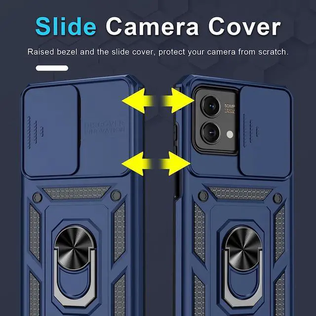 Features: Compatible with Motorola Moto G Stylus 5G 2023. Military Standard Shock Test MIL-STD 810G- 516.6 Protection. The case endured 26 drops (at 48in) on all 6 faces, 12 edges and 8 corners of the device and sustained zero damage to the appearance and internal hardware of the phone itself. Made from a special strong and lightweight durable material, providing you with long lasting protection for your smartphone without making it cumbersome. Ring holder for extra drop protection - in more ways than one. The built-it ring features a 180 & 360 degree rotating design to ensure a comfortable grip at any angle. Flip the ring out and it doubles as a kickstand to take your binge-watching experience to the next level. Privacy cover slides in front of camera when not in use. Unique mix material hybrid design.
