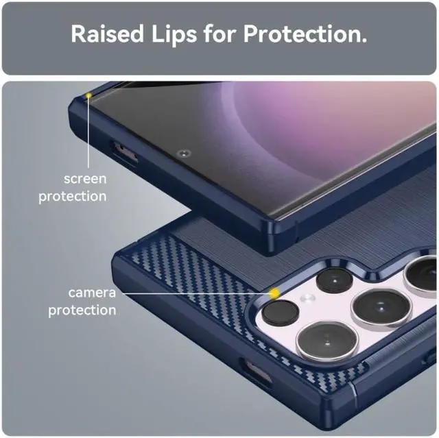 Flexible rugged casing with a premium matte finish non-slip carbon fiber and brushed metal design, the Brushed Metal Design TPU Case keeps your Samsung Galaxy S24 Ultra protected with air cushion in all corners for added protection against drops, while raised edges provides bolstered screen protection.