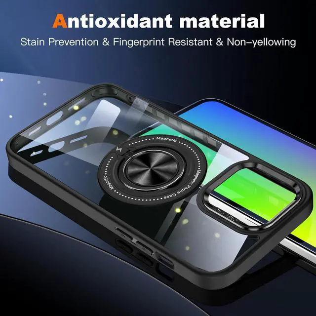 Features: Compatible with Apple iPhone 15 Pro. Designed to interact with Apple’ s MagSafe ecosystem. Built-in magnetic ring for strengthened MagSafe connections. Compatible with Apple MagSafe chargers and accessories so you can power up without removing the case. Crystal clear case provides a slim fitting stylish design and air cushion corner shock protection against damage, keeping your device looking great at all time. Made from reinforced bonded thermopolyurethane and optical grade polycarbonate materials, which makes it flexible enough to absorb punishment but hard enough to resist potential damage. Designed to be slim, lightweight and strong - so you can be assured that this case will add virtually no extra bulk to your phone and will still fit in your pocket with ease. Ring holder for extra drop protection - in more ways than one. The built-it ring features a rotating design to ensure a comfortable grip at any angle. Flip the Ring out and it doubles as a kickstand to take your binge-watching experience to the next level. Raised bezels on the case protects your phone's screen and camera from scratches. Anti-yellow 100% clear case.