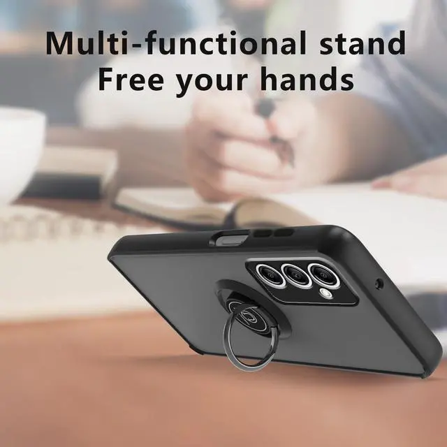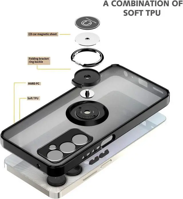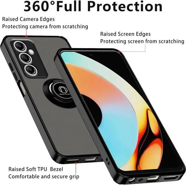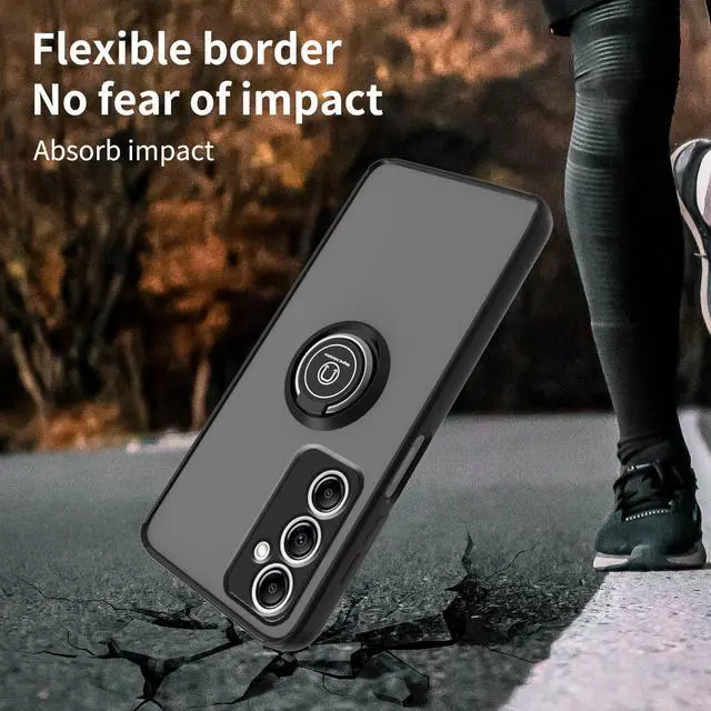 Features: Compatible with Samsung Galaxy A15 5G. Stylish, minimalist protection for your smartphone. Premium dual-material construction with polycarbonate backing and TPU perimeter creates a sleek profile without sacrificing protection. An adjustable integrated 180 and 360 degree gear rotating ring finger holder prevents your phone from accidental drops and slips. Lightweight frosted matte transparent polycarbonate backing with smooth silky surface protects against scratches and dings. Impact-absorbing TPU perimeter guards the device against bumps and drops. This case adds virtually no bulk to your device, so you can carry your phone in your pocket and use it as you normally would without any significant change. This case is effortlessly easy to install and looks great on your phone. Front bumpers raised slightly above your screen act to protect your screen when placed face down or dropped. Integrated tempered glass camera lens protector protects the lens from scratches and accidental drops. Enjoy magnetic mount compatibility, as the ring holder also functions as a built-in metal plate. Precisely cutouts to preserve full use of volume buttons, charger, camera, microphone, and all other ports.