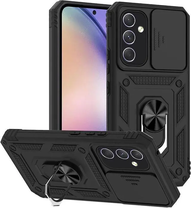 Features: Compatible with Samsung Galaxy A15 5G. Military Standard Shock Test MIL-STD 810G- 516.6 Protection. The case endured 26 drops (at 48in) on all 6 faces, 12 edges and 8 corners of the device and sustained zero damage to the appearance and internal hardware of the phone itself. Made from a special strong and lightweight durable material, providing you with long lasting protection for your smartphone without making it cumbersome. Ring holder for extra drop protection - in more ways than one. The built-it ring features a 180 & 360 degree rotating design to ensure a comfortable grip at any angle. Flip the ring out and it doubles as a kickstand to take your binge-watching experience to the next level. Privacy cover slides in front of camera when not in use. Unique mix material hybrid design.