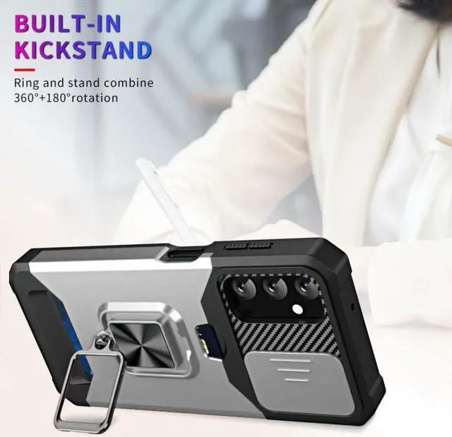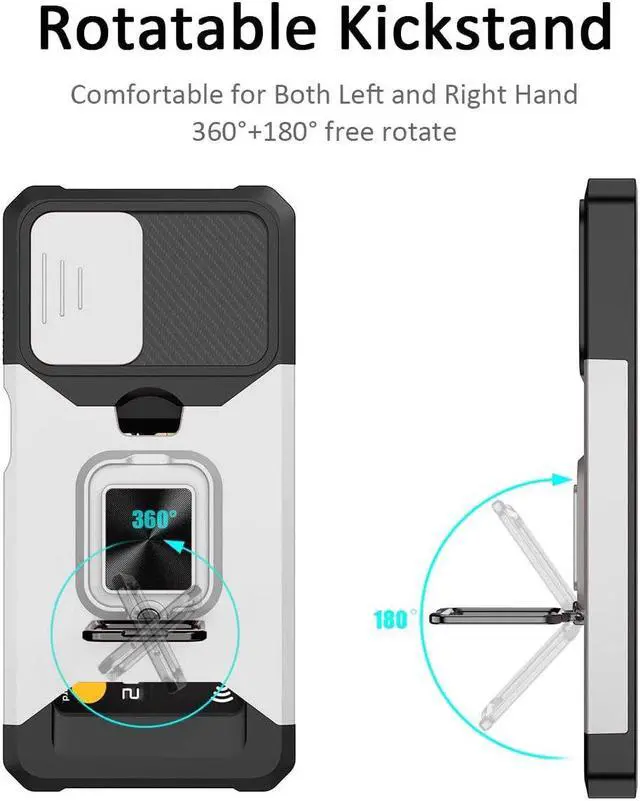 Features: Compatible with Samsung Galaxy A15 5G. Military Standard Shock Test MIL-STD 810G- 516.6 Protection. The case endured 26 drops (at 48in) on all 6 faces, 12 edges and 8 corners of the device and sustained zero damage to the appearance and internal hardware of the phone itself. Stylish, minimalist protection for your smartphone. Crafted from anti-scratch TPU and a super strong polycarbonate frame, the case protects your device while complimenting its sleek aesthetics. Reinforced corners are designed to deflect shock force away from your phone and the corners are the most vulnerable areas of any phone or case. The back of the case has a built-in extremely practical handle, Ring, which can be put on the finger to hold the phone more securely in your hand. Flip the ring out and it doubles as a kickstand to take your binge-watching experience to the next level. With this case, you can leave your wallet at home thanks to the credit card slot featured on the case. Privacy camera cover slides left or right for total protection. Impact-absorbing TPU perimeter guards the device against bumps and drops.