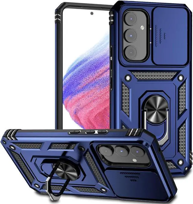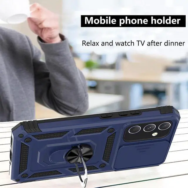 Features: Compatible with Samsung Galaxy A15 5G. Military Standard Shock Test MIL-STD 810G- 516.6 Protection. The case endured 26 drops (at 48in) on all 6 faces, 12 edges and 8 corners of the device and sustained zero damage to the appearance and internal hardware of the phone itself. Made from a special strong and lightweight durable material, providing you with long lasting protection for your smartphone without making it cumbersome. Ring holder for extra drop protection - in more ways than one. The built-it ring features a 180 & 360 degree rotating design to ensure a comfortable grip at any angle. Flip the ring out and it doubles as a kickstand to take your binge-watching experience to the next level. Privacy cover slides in front of camera when not in use. Unique mix material hybrid design.