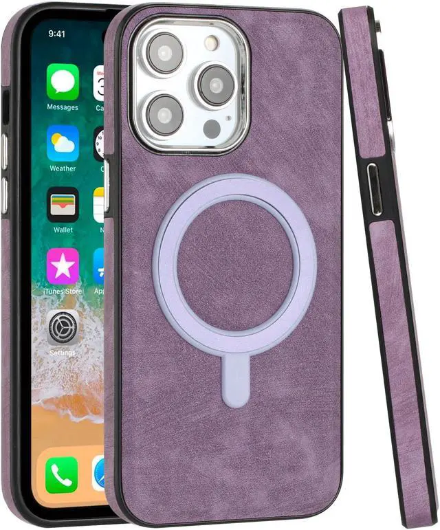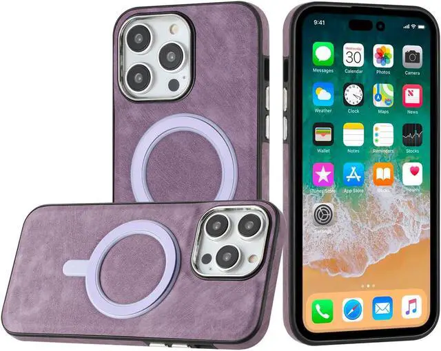 Features: Compatible with Apple iPhone 14 Pro Max. Designed to interact with Apple’ s MagSafe ecosystem. Compatible with Apple MagSafe chargers and accessories so you can power up without removing the case. Thanks to the case's design, your phone won't have added bulk all the way around, helping to keep your phone as slim and light as it was designed to be. The stylish leather finish not only feels great in hand, but it also provides excellent grip - reducing the risk of accidental drops and bumps. Premium TPU bumper material for durable flexibility. Front bumpers raised slightly above your screen act to protect your screen when placed face down or dropped. Raised camera cut-out with integrated camera lens bumper protector protects the lens from scratches when placing your phone on flat surface. Micro fiber inner lining. Embossed buttons for an easy, conspicuous press. Precisely cutouts to preserve full use of volume buttons, charger, camera, microphone, and all other ports.