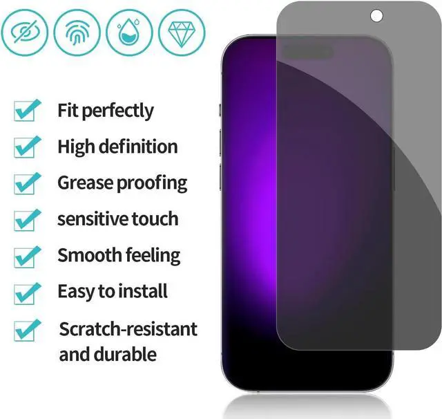 Features: Compatible with Apple iPhone 15 Pro Max. Now you can protect your screen from prying eyes on all sides. A 2-way filter shields your screen, so you’ ve got all-around privacy protection when someone tries to take a peek. Our privacy filter hides your screen when viewed from the side but stays perfectly clear when viewed straight on. Engineered to offer five times the strength of an unprotected screen. Advanced Impact Protection - Protect your smartphone with slim, ultra-strong aluminosilicate glass. Slim Design - The super-thin 0.33 mm glass preserves screen sensitivity to respond accurately to your touch. Feels Like Your Natural Screen - Your finger glides smoothly over the screen protector, just like it does over your device. Intelligent glass composition reacts like the natural screen. Advanced Defense Against Scratches - Rigorous testing proves a hardness rating of 9H - the highest level of scratch protection available. Reinforced edges which prevent chipping to prevent cracks from starting and spreading. Anti-Fingerprint Coating - Engineered with fingerprint and oil resistance, you’ ll have a screen that’ s feeling clean and looking clear.