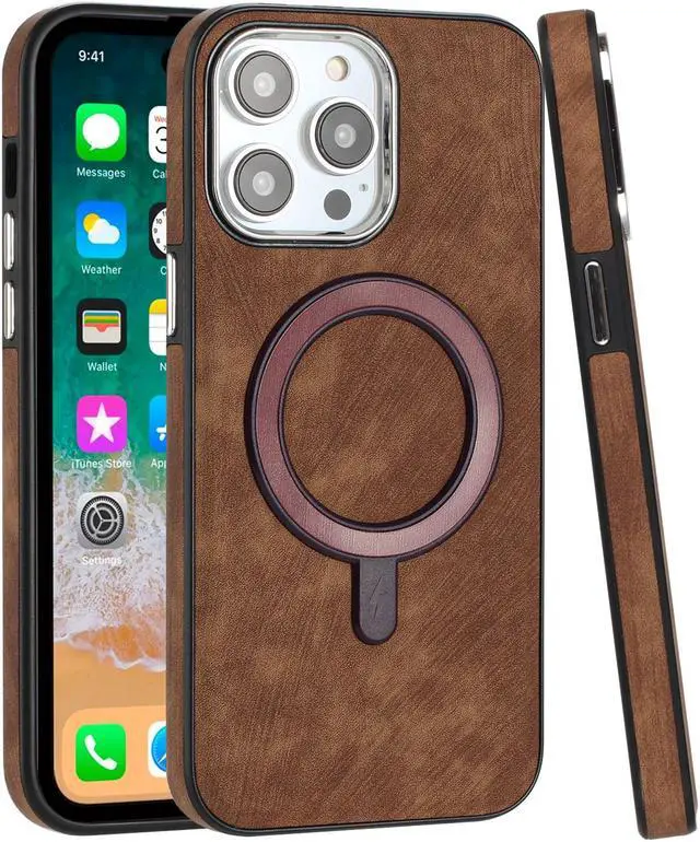 Features: Compatible with Apple iPhone 14 Pro Max. Designed to interact with Apple’ s MagSafe ecosystem. Compatible with Apple MagSafe chargers and accessories so you can power up without removing the case. Thanks to the case's design, your phone won't have added bulk all the way around, helping to keep your phone as slim and light as it was designed to be. The stylish leather finish not only feels great in hand, but it also provides excellent grip - reducing the risk of accidental drops and bumps. Premium TPU bumper material for durable flexibility. Front bumpers raised slightly above your screen act to protect your screen when placed face down or dropped. Raised camera cut-out with integrated camera lens bumper protector protects the lens from scratches when placing your phone on flat surface. Micro fiber inner lining. Embossed buttons for an easy, conspicuous press. Precisely cutouts to preserve full use of volume buttons, charger, camera, microphone, and all other ports.