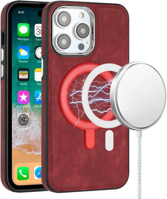 Features: Compatible with Apple iPhone 14 Pro Max. Designed to interact with Apple’ s MagSafe ecosystem. Compatible with Apple MagSafe chargers and accessories so you can power up without removing the case. Thanks to the case's design, your phone won't have added bulk all the way around, helping to keep your phone as slim and light as it was designed to be. The stylish leather finish not only feels great in hand, but it also provides excellent grip - reducing the risk of accidental drops and bumps. Premium TPU bumper material for durable flexibility. Front bumpers raised slightly above your screen act to protect your screen when placed face down or dropped. Raised camera cut-out with integrated camera lens bumper protector protects the lens from scratches when placing your phone on flat surface. Micro fiber inner lining. Embossed buttons for an easy, conspicuous press. Precisely cutouts to preserve full use of volume buttons, charger, camera, microphone, and all other ports.