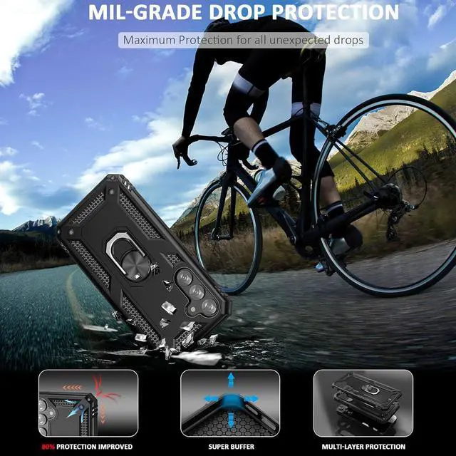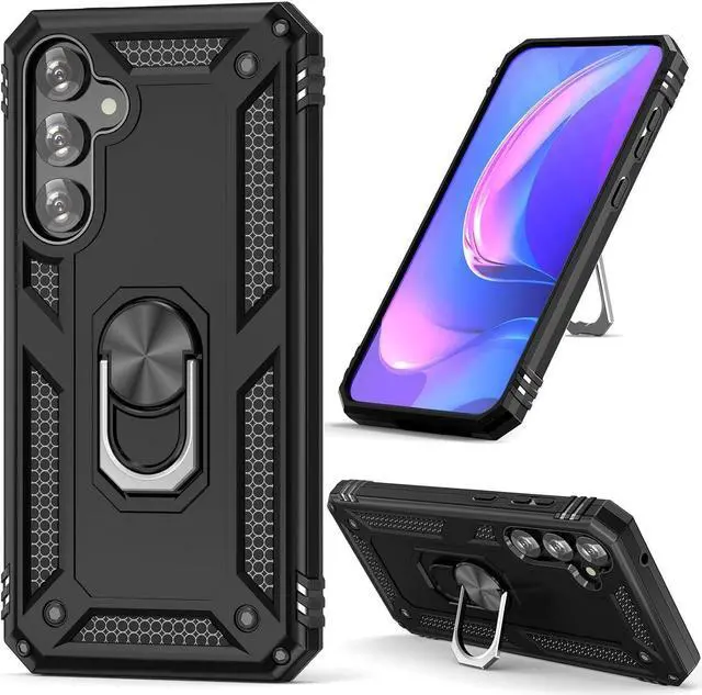 Features: Compatible with Samsung Galaxy S23 FE. Military Standard Shock Test MIL-STD 810G- 516.6 Protection. The case endured 26 drops (at 48in) on all 6 faces, 12 edges and 8 corners of the device and sustained zero damage to the appearance and internal hardware of the phone itself. Made from a special strong and lightweight durable material, providing you with long lasting protection for your smartphone without making it cumbersome. Ring holder for extra drop protection - in more ways than one. The built-it ring features a 180 & 360 degree rotating design to ensure a comfortable grip at any angle. Flip the ring out and it doubles as a kickstand to take your binge-watching experience to the next level. Unique mix material hybrid design.