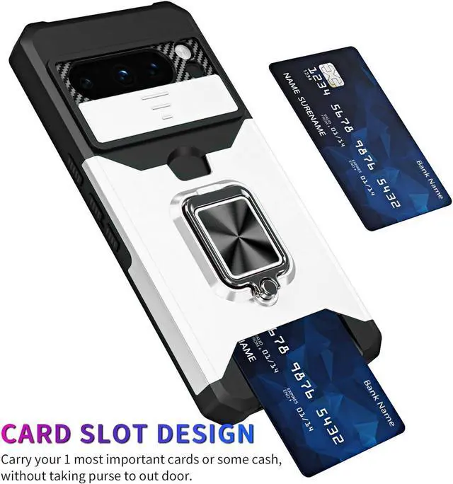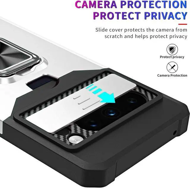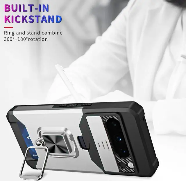 Features: Compatible with Google Pixel 8 Pro. Military Standard Shock Test MIL-STD 810G- 516.6 Protection. The case endured 26 drops (at 48in) on all 6 faces, 12 edges and 8 corners of the device and sustained zero damage to the appearance and internal hardware of the phone itself. Stylish, minimalist protection for your smartphone. Crafted from anti-scratch TPU and a super strong polycarbonate frame, the case protects your device while complimenting its sleek aesthetics. Reinforced corners are designed to deflect shock force away from your phone and the corners are the most vulnerable areas of any phone or case. The back of the case has a built-in extremely practical handle, Ring, which can be put on the finger to hold the phone more securely in your hand. Flip the ring out and it doubles as a kickstand to take your binge-watching experience to the next level. With this case, you can leave your wallet at home thanks to the credit card slot featured on the case. Privacy camera cover for total protection. Impact-absorbing TPU perimeter guards the device against bumps and drops. This case is effortlessly easy to install and looks great on your phone.
