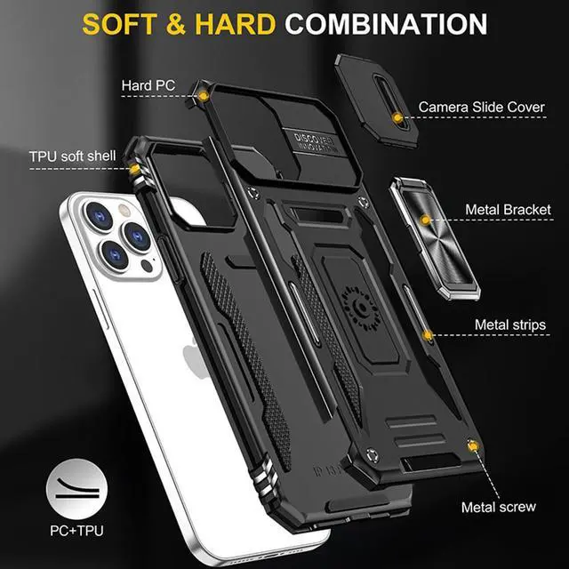 Features: Compatible with Apple iPhone 15. Military Standard Shock Test MIL-STD 810G- 516.6 Protection. The case endured 26 drops (at 48in) on all 6 faces, 12 edges and 8 corners of the device and sustained zero damage to the appearance and internal hardware of the phone itself. Made from a special strong and lightweight durable material, providing you with long lasting protection for your smartphone without making it cumbersome. The case features a handy finger loop that keeps your phone securely in hand while on your next adventure and even works as a viewing stand to watch movies. The ring grip folds flat and out of view if you do not want or need it. But if you do, simply pull the loop out, slip your finger through and you have an extra secure grip on your phone. Unique mix material hybrid design. This hard-wearing tough case safe-guards your phone against whatever life can throw your way, keeping your device secure at all times even in the most extreme of conditions. Raised front bezel and camera opening prevent scratches to the screen and camera lens. Privacy camera cover slides left or right for total protection.