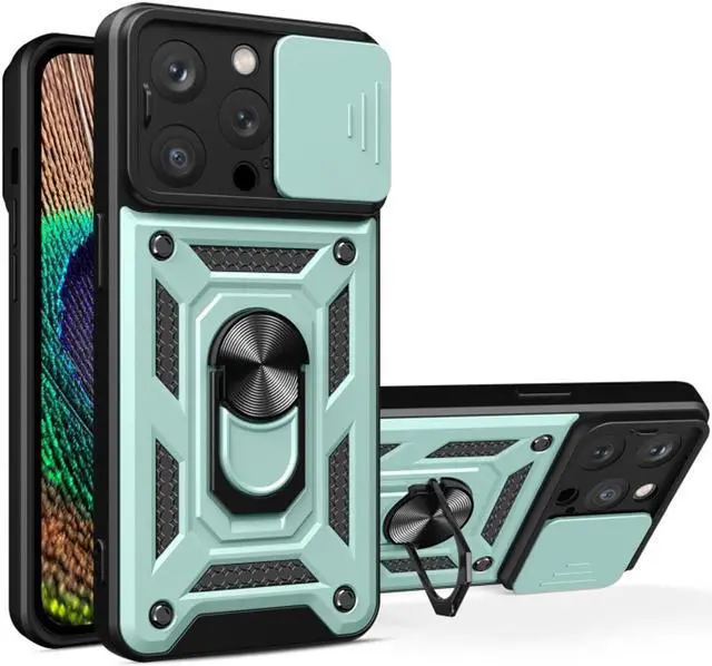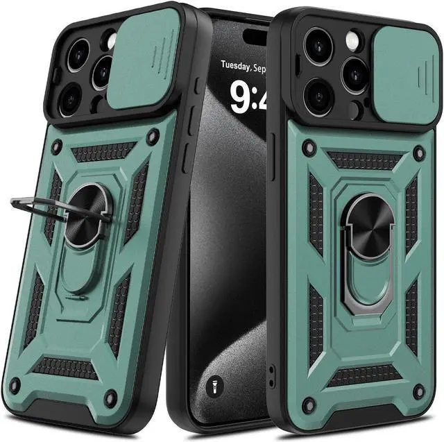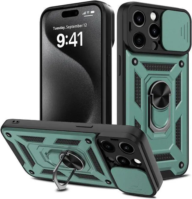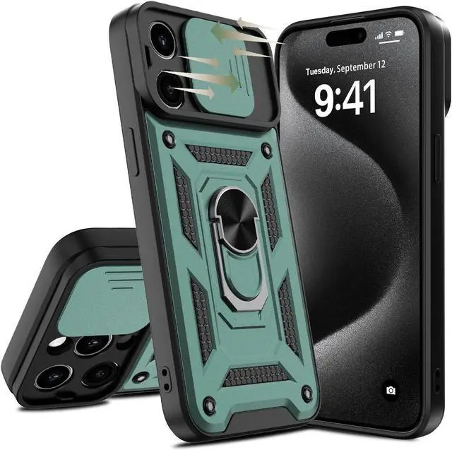 Features: Compatible with Apple iPhone 15 Pro. Extensively drop tested, so you can feel reassured that your device is well protected. Stylish, minimalist protection for your smartphone. Premium dual-material construction with polycarbonate backing and TPU perimeter creates a sleek profile without sacrificing protection. Ring holder for extra drop protection - in more ways than one. The built-it ring features a 180 and 360 degree rotating design to ensure a comfortable grip at any angle. Flip the Ring out and it doubles as a kickstand to take your binge-watching experience to the next level. Polycarbonate panel slides to lock over camera lens area protecting lenses as well as promoting camera security. Impact-absorbing TPU perimeter guards the device against bumps and drops. This case is effortlessly easy to install and looks great on your phone. Front bumpers raised slightly above your screen act to protect your screen when placed face down or dropped. Raised camera cut-out protects the lens from scratches when placing your phone on flat surface. Enjoy magnetic mount compatibility, as the ring holder also functions as a built-in metal plate. Antimicrobial case protection.