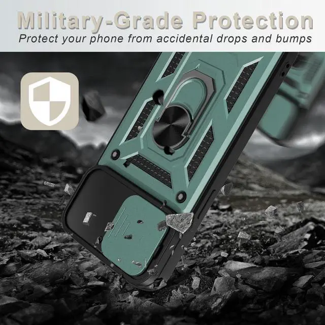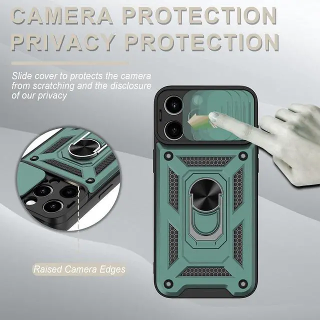 Features: Compatible with Apple iPhone 15 Pro Max. Extensively drop tested, so you can feel reassured that your device is well protected. Stylish, minimalist protection for your smartphone. Premium dual-material construction with polycarbonate backing and TPU perimeter creates a sleek profile without sacrificing protection. Ring holder for extra drop protection - in more ways than one. The built-it ring features a 180 and 360 degree rotating design to ensure a comfortable grip at any angle. Flip the Ring out and it doubles as a kickstand to take your binge-watching experience to the next level. Polycarbonate panel slides to lock over camera lens area protecting lenses as well as promoting camera security. Impact-absorbing TPU perimeter guards the device against bumps and drops. This case is effortlessly easy to install and looks great on your phone. Front bumpers raised slightly above your screen act to protect your screen when placed face down or dropped. Raised camera cut-out protects the lens from scratches when placing your phone on flat surface. Enjoy magnetic mount compatibility, as the ring holder also functions as a built-in metal plate. Antimicrobial case protection.