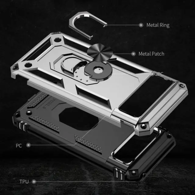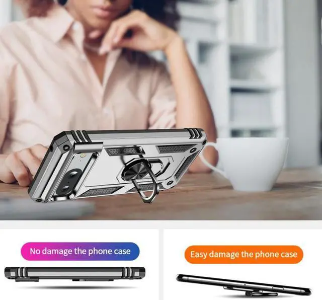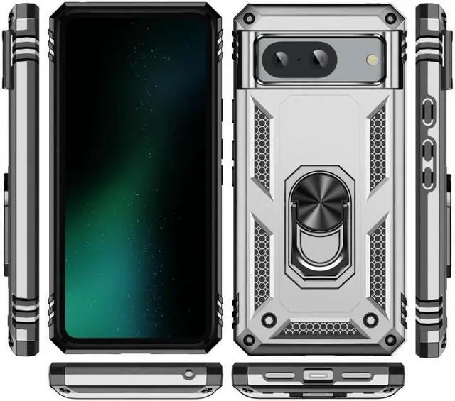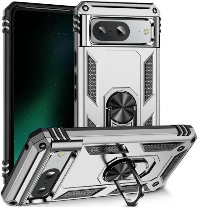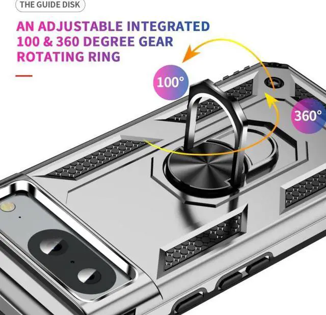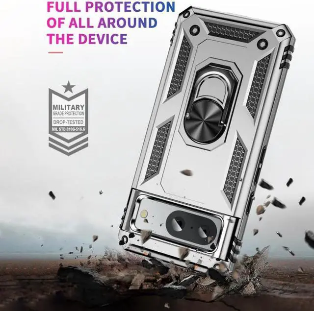 Features: Compatible with Google Pixel 8. Military Standard Shock Test MIL-STD 810G- 516.6 Protection. The case endured 26 drops (at 48in) on all 6 faces, 12 edges and 8 corners of the device and sustained zero damage to the appearance and internal hardware of the phone itself. Made from a special strong and lightweight durable material, providing you with long lasting protection for your smartphone without making it cumbersome. Ring holder for extra drop protection - in more ways than one. The built-it ring features a 180 & 360 degree rotating design to ensure a comfortable grip at any angle. Flip the ring out and it doubles as a kickstand to take your binge-watching experience to the next level. Unique mix material hybrid design.
