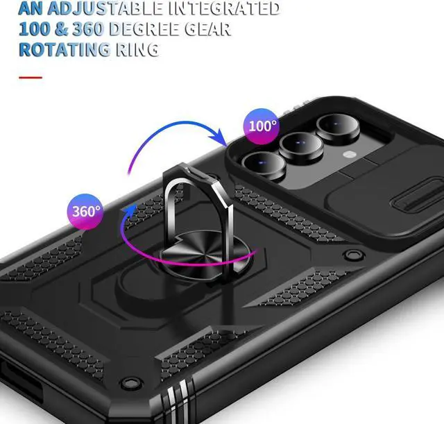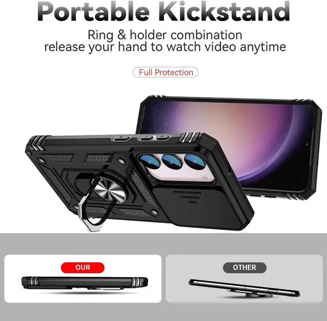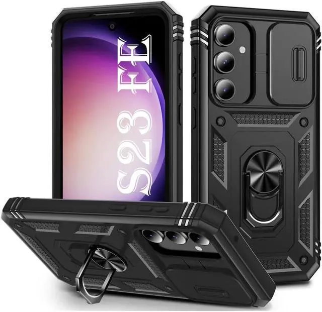 Features: Compatible with Samsung Galaxy S23 FE. Military Standard Shock Test MIL-STD 810G- 516.6 Protection. The case endured 26 drops (at 48in) on all 6 faces, 12 edges and 8 corners of the device and sustained zero damage to the appearance and internal hardware of the phone itself. Made from a special strong and lightweight durable material, providing you with long lasting protection for your smartphone without making it cumbersome. Ring holder for extra drop protection - in more ways than one. The built-it ring features a 180 & 360 degree rotating design to ensure a comfortable grip at any angle. Flip the ring out and it doubles as a kickstand to take your binge-watching experience to the next level. Privacy cover slides in front of camera when not in use. Unique mix material hybrid design.