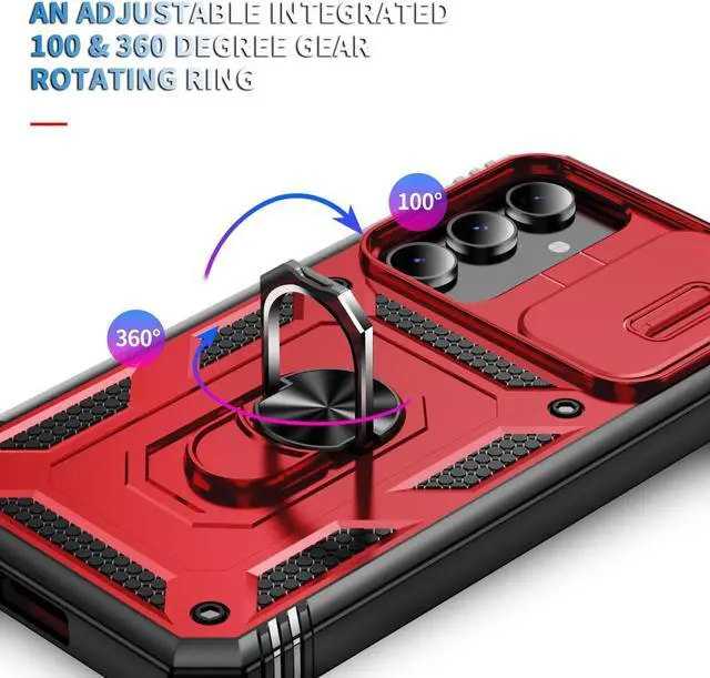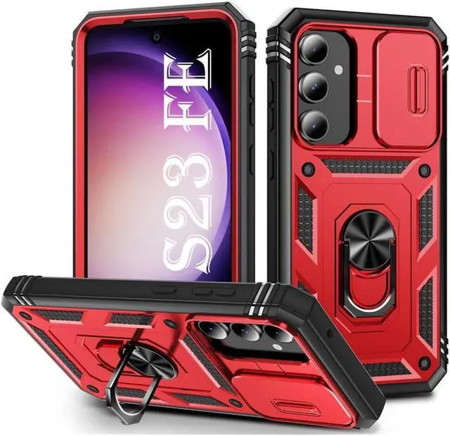 Features: Compatible with Samsung Galaxy S23 FE. Military Standard Shock Test MIL-STD 810G- 516.6 Protection. The case endured 26 drops (at 48in) on all 6 faces, 12 edges and 8 corners of the device and sustained zero damage to the appearance and internal hardware of the phone itself. Made from a special strong and lightweight durable material, providing you with long lasting protection for your smartphone without making it cumbersome. Ring holder for extra drop protection - in more ways than one. The built-it ring features a 180 & 360 degree rotating design to ensure a comfortable grip at any angle. Flip the ring out and it doubles as a kickstand to take your binge-watching experience to the next level. Privacy cover slides in front of camera when not in use. Unique mix material hybrid design.