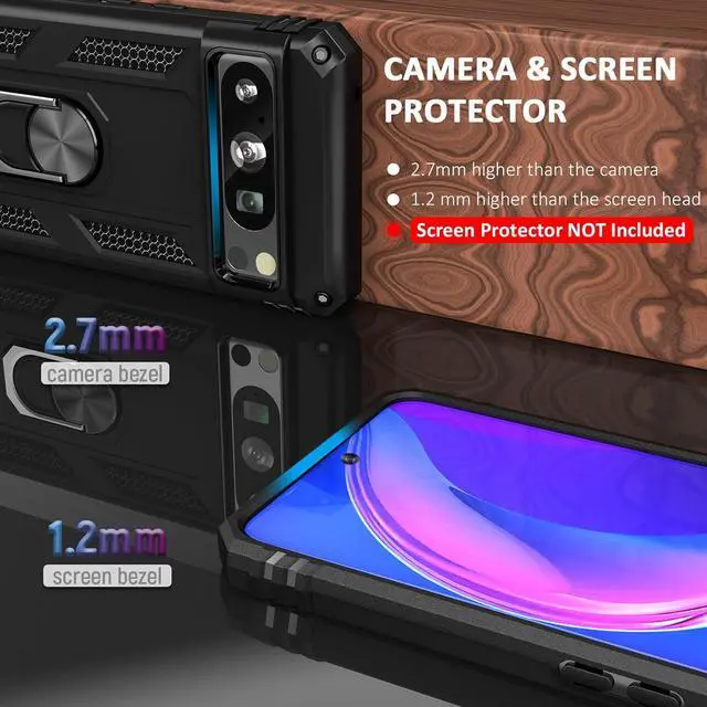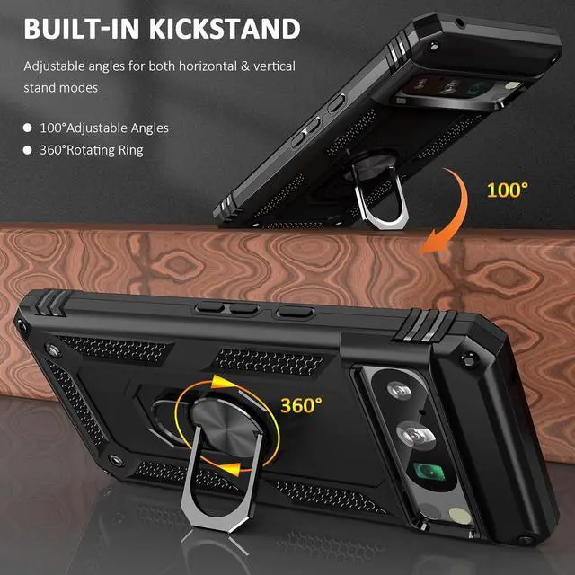 Features: Compatible with Google Pixel 8 Pro. Military Standard Shock Test MIL-STD 810G- 516.6 Protection. The case endured 26 drops (at 48in) on all 6 faces, 12 edges and 8 corners of the device and sustained zero damage to the appearance and internal hardware of the phone itself. Made from a special strong and lightweight durable material, providing you with long lasting protection for your smartphone without making it cumbersome. Ring holder for extra drop protection - in more ways than one. The built-it ring features a 180 & 360 degree rotating design to ensure a comfortable grip at any angle. Flip the ring out and it doubles as a kickstand to take your binge-watching experience to the next level. Unique mix material hybrid design.