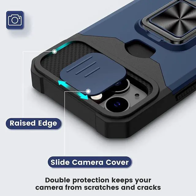 Features: Compatible with Apple iPhone 15 Plus. Military Standard Shock Test MIL-STD 810G- 516.6 Protection. The case endured 26 drops (at 48in) on all 6 faces, 12 edges and 8 corners of the device and sustained zero damage to the appearance and internal hardware of the phone itself. Stylish, minimalist protection for your smartphone. Crafted from anti-scratch TPU and a super strong polycarbonate frame, the case protects your device while complimenting its sleek aesthetics. Reinforced corners are designed to deflect shock force away from your phone and the corners are the most vulnerable areas of any phone or case. The back of the case has a built-in extremely practical handle, Ring, which can be put on the finger to hold the phone more securely in your hand. It also allows you to attach the phone to a magnetic car holder. Flip the ring out and it doubles as a kickstand to take your binge-watching experience to the next level. With this case, you can leave your wallet at home thanks to the credit card slot featured on the case. Privacy cover slides in front of camera when not in use.