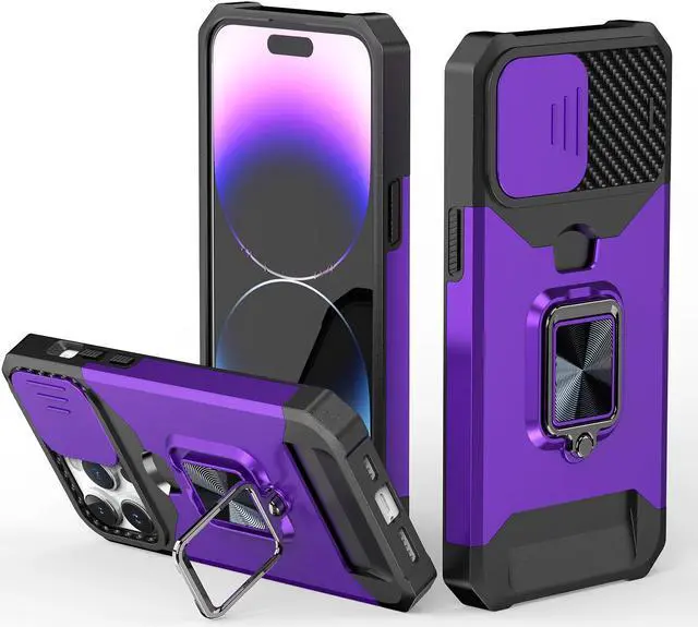 Features: Compatible with Apple iPhone 15. Military Standard Shock Test MIL-STD 810G- 516.6 Protection. The case endured 26 drops (at 48in) on all 6 faces, 12 edges and 8 corners of the device and sustained zero damage to the appearance and internal hardware of the phone itself. Stylish, minimalist protection for your smartphone. Crafted from anti-scratch TPU and a super strong polycarbonate frame, the case protects your device while complimenting its sleek aesthetics. Reinforced corners are designed to deflect shock force away from your phone and the corners are the most vulnerable areas of any phone or case. The back of the case has a built-in extremely practical handle, Ring, which can be put on the finger to hold the phone more securely in your hand. It also allows you to attach the phone to a magnetic car holder. Flip the ring out and it doubles as a kickstand to take your binge-watching experience to the next level. With this case, you can leave your wallet at home thanks to the credit card slot featured on the case. Privacy cover slides in front of camera when not in use.