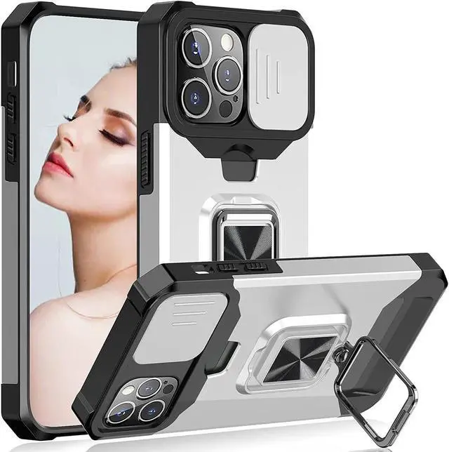 Features: Compatible with Apple iPhone 15 Pro. Military Standard Shock Test MIL-STD 810G- 516.6 Protection. The case endured 26 drops (at 48in) on all 6 faces, 12 edges and 8 corners of the device and sustained zero damage to the appearance and internal hardware of the phone itself. Stylish, minimalist protection for your smartphone. Crafted from anti-scratch TPU and a super strong polycarbonate frame, the case protects your device while complimenting its sleek aesthetics. Reinforced corners are designed to deflect shock force away from your phone and the corners are the most vulnerable areas of any phone or case. The back of the case has a built-in extremely practical handle, Ring, which can be put on the finger to hold the phone more securely in your hand. It also allows you to attach the phone to a magnetic car holder. Flip the ring out and it doubles as a kickstand to take your binge-watching experience to the next level. With this case, you can leave your wallet at home thanks to the credit card slot featured on the case. Privacy cover slides in front of camera when not in use.
