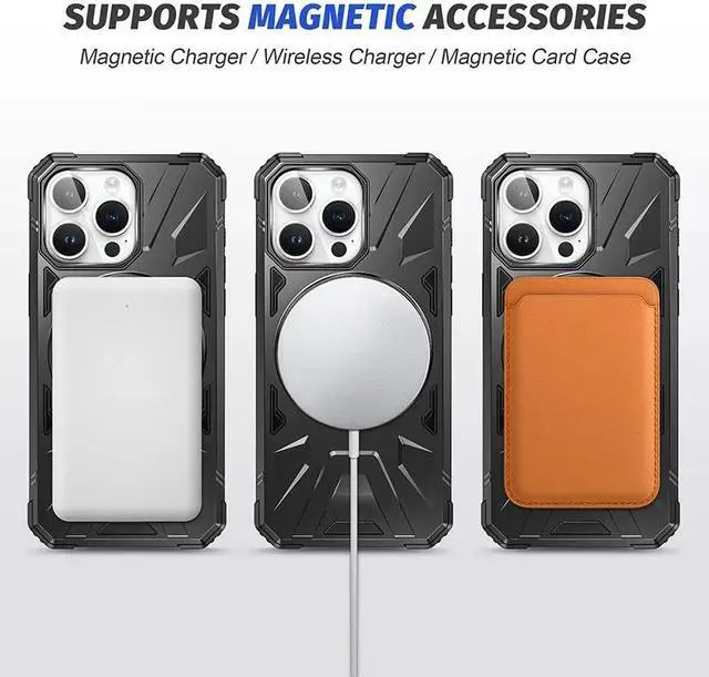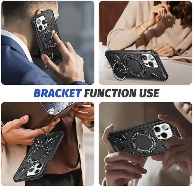 Features: Compatible with Apple iPhone 15 Pro. Designed to interact with Apple’ s MagSafe ecosystem. Built-in magnetic ring for strengthened MagSafe connections. Compatible with Apple MagSafe chargers and accessories so you can power up without removing the case. Military Standard Shock Test MIL-STD 810G- 516.6 Protection. The case endured 26 drops (at 48in) on all 6 faces, 12 edges and 8 corners of the device and sustained zero damage to the appearance and internal hardware of the phone itself. Ring holder for extra drop protection - in more ways than one. The built-it ring features a rotating design to ensure a comfortable grip at any angle. Flip the Ring out and it doubles as a kickstand to take your binge-watching experience to the next level. Featuring a robust multi-layered design, the case provides extreme protection for your device. This hard-wearing tough case safe-guards your phone against whatever life can throw at, keeping it secure at all times even in the most extreme of conditions. Reinforced shock absorbing air cushion corners provide excellent protection where it's most needed. A soft rubberized TPU inner core tightly grips to your phone while absorbs shock and cushions the phone from drops and impact.