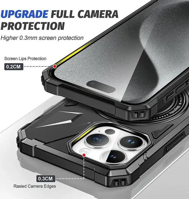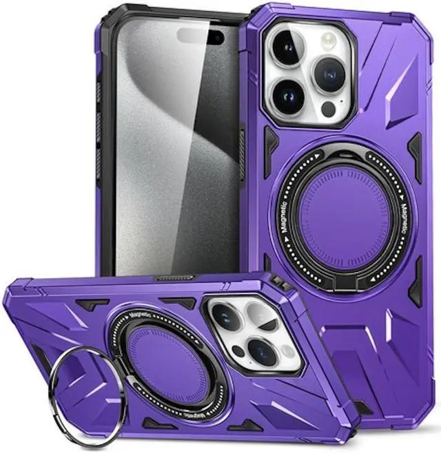 Features: Compatible with Apple iPhone 15 Plus. Designed to interact with Apple’ s MagSafe ecosystem. Built-in magnetic ring for strengthened MagSafe connections. Compatible with Apple MagSafe chargers and accessories so you can power up without removing the case. Military Standard Shock Test MIL-STD 810G- 516.6 Protection. The case endured 26 drops (at 48in) on all 6 faces, 12 edges and 8 corners of the device and sustained zero damage to the appearance and internal hardware of the phone itself. Ring holder for extra drop protection - in more ways than one. The built-it ring features a rotating design to ensure a comfortable grip at any angle. Flip the Ring out and it doubles as a kickstand to take your binge-watching experience to the next level. Featuring a robust multi-layered design, the case provides extreme protection for your device. This hard-wearing tough case safe-guards your phone against whatever life can throw at, keeping it secure at all times even in the most extreme of conditions. Reinforced shock absorbing air cushion corners provide excellent protection where it's most needed. A soft rubberized TPU inner core tightly grips to your phone while absorbs shock and cushions the phone from drops and impact.