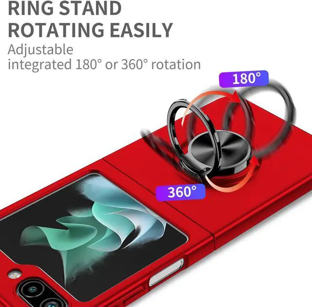 Features: Compatible with Samsung Galaxy Z Flip 5. The cover protects without being a bulky addition to your phone. It is designed with a slim form factor, keeping the sleek design of your phone intact. The cover material is durable even against scratches so it stays safe in your pocket or purse with ease. Protect your phone's corners and exterior to keep it safe from damage. Add protection while maintaining Galaxy Z Flip5's shape and the pocketable compact size. The thin material wraps around your phone and while enhancing the grip so your hands stay comfortable. The back of the case has a built-in extremely practical handle, Ring, which can be put on the finger to hold the phone more securely in your hand. Pull the ring out and have a handy viewing stand to comfortably watch your favorite show. Raised beveled edge offers front screen protection. The simple and easy installation allows the cover to be attached in no time. simply clip onto the top half and bottom half of the phone individually and away you go. Enjoy magnetic mount compatibility, as the ring holder also functions as a built-in metal plate.