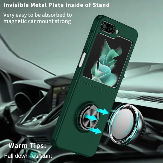 Features: Compatible with Samsung Galaxy Z Flip 5. The cover protects without being a bulky addition to your phone. It is designed with a slim form factor, keeping the sleek design of your phone intact. The cover material is durable even against scratches so it stays safe in your pocket or purse with ease. Protect your phone's corners and exterior to keep it safe from damage. Add protection while maintaining Galaxy Z Flip5's shape and the pocketable compact size. The thin material wraps around your phone and while enhancing the grip so your hands stay comfortable. The back of the case has a built-in extremely practical handle, Ring, which can be put on the finger to hold the phone more securely in your hand. Pull the ring out and have a handy viewing stand to comfortably watch your favorite show. Raised beveled edge offers front screen protection. The simple and easy installation allows the cover to be attached in no time. simply clip onto the top half and bottom half of the phone individually and away you go. Enjoy magnetic mount compatibility, as the ring holder also functions as a built-in metal plate.
