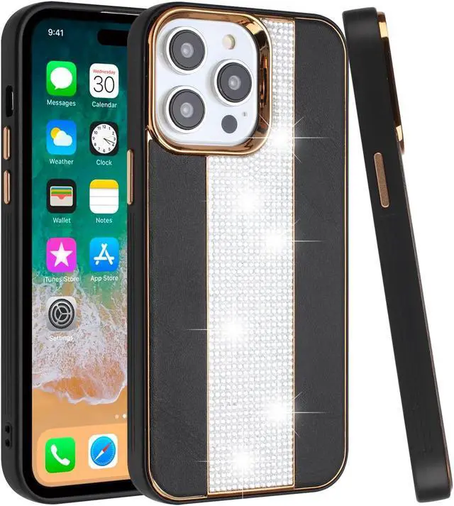 Features: Compatible with Apple iPhone 14. Premium bling swarovski-grade crystal rhinestones embedded onto the case. The stylish crystal rhinestone and leather finish not only feels great in hand, but it also provides excellent grip - reducing the risk of accidental drops and bumps. Premium dual-material construction with polycarbonate backing and TPU perimeter creates a sleek profile without sacrificing protection. Front bumpers raised slightly above your screen act to protect your screen when placed face down or dropped. Raised camera cut-out with integrated camera lens bumper protector protects the lens from scratches when placing your phone on flat surface. Soft microfiber lining on the inside helps protect your phone. Precisely cutouts to preserve full use of volume buttons, charger, camera, microphone, and all other ports.