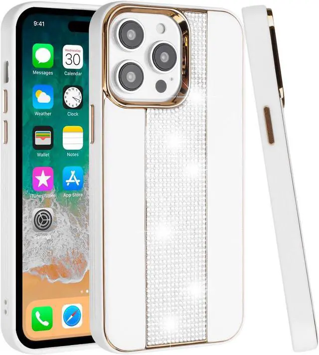 Features: Compatible with Apple iPhone 14. Premium bling swarovski-grade crystal rhinestones embedded onto the case. The stylish crystal rhinestone and leather finish not only feels great in hand, but it also provides excellent grip - reducing the risk of accidental drops and bumps. Premium dual-material construction with polycarbonate backing and TPU perimeter creates a sleek profile without sacrificing protection. Front bumpers raised slightly above your screen act to protect your screen when placed face down or dropped. Raised camera cut-out with integrated camera lens bumper protector protects the lens from scratches when placing your phone on flat surface. Soft microfiber lining on the inside helps protect your phone. Precisely cutouts to preserve full use of volume buttons, charger, camera, microphone, and all other ports.