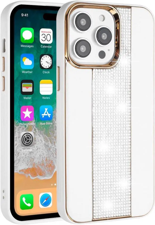 Features: Compatible with Apple iPhone 14 Pro Max. Premium bling swarovski-grade crystal rhinestones embedded onto the case. The stylish crystal rhinestone and leather finish not only feels great in hand, but it also provides excellent grip - reducing the risk of accidental drops and bumps. Premium dual-material construction with polycarbonate backing and TPU perimeter creates a sleek profile without sacrificing protection. Front bumpers raised slightly above your screen act to protect your screen when placed face down or dropped. Raised camera cut-out with integrated camera lens bumper protector protects the lens from scratches when placing your phone on flat surface. Soft microfiber lining on the inside helps protect your phone. Precisely cutouts to preserve full use of volume buttons, charger, camera, microphone, and all other ports.
