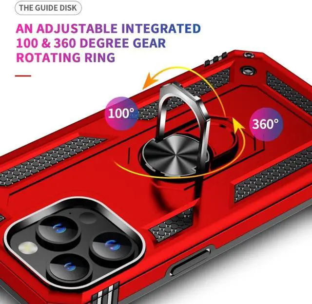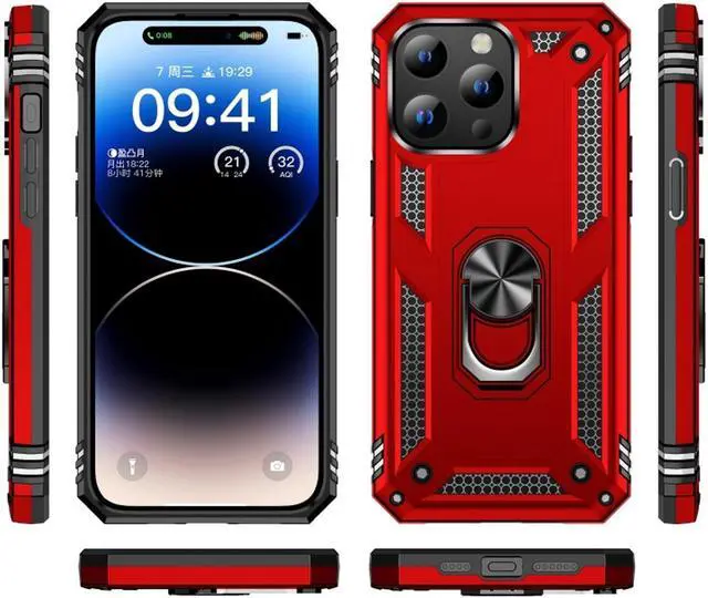 Features: Compatible with Apple iPhone 15 Pro. Military Standard Shock Test MIL-STD 810G- 516.6 Protection. The case endured 26 drops (at 48in) on all 6 faces, 12 edges and 8 corners of the device and sustained zero damage to the appearance and internal hardware of the phone itself. Made from a special strong and lightweight durable material, providing you with long lasting protection for your smartphone without making it cumbersome. Ring holder for extra drop protection - in more ways than one. The built-it ring features a 180 and 360 degree rotating design to ensure a comfortable grip at any angle. Flip the ring out and it doubles as a kickstand to take your binge-watching experience to the next level. Unique mix material hybrid design.