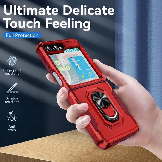Features: Compatible with Samsung Galaxy Z Flip 5. Extensively drop tested, so you can feel reassured that your device is well protected. Featuring a robust multi-layered design, the Tuff Case provides extreme protection for your device. This hard-wearing tough case safe-guards your phone against whatever life can throw at, keeping it secure at all times even in the most extreme of conditions. A soft rubberized TPU inner core tightly grips to your phone while absorbs shock and cushions the phone from drops and impact. Patented hybrid case with ridge polycarbonate hard shell for armor-like protection. The back of the case has a built-in extremely practical handle, Ring, which can be put on the finger to hold the phone more securely in your hand. Pull the ring out and have a handy viewing stand to comfortably watch your favorite show. Raised front bezel and camera opening prevent scratches to the screen and camera lens. Textured rubbery interior for impact resistant protection. Intuitive button covers for a tactile experience. Enjoy magnetic mount compatibility, as the ring holder also functions as a built-in metal plate. Precise cutouts provide full access to your phone’ s important features, ports and buttons.