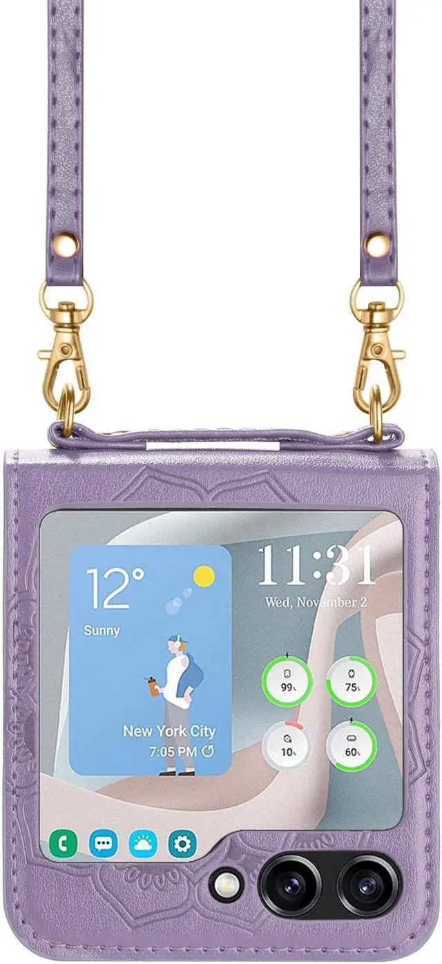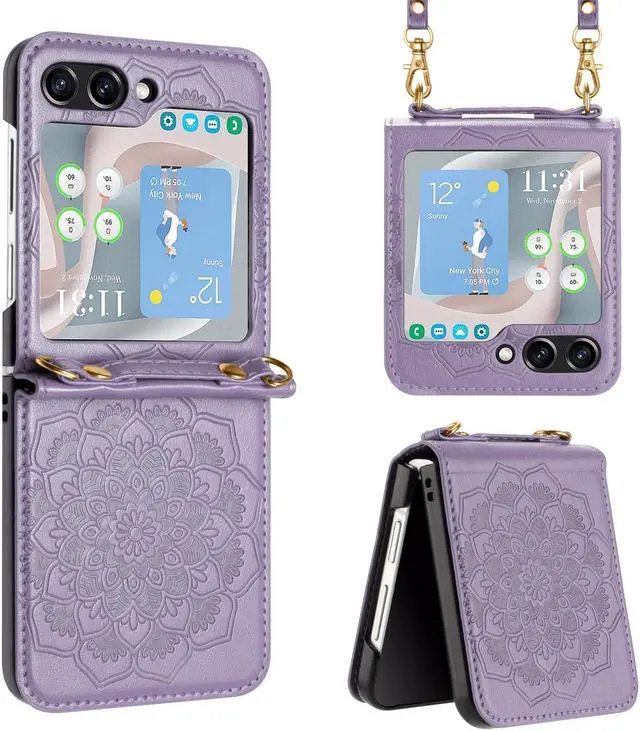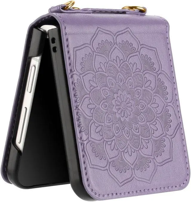 Features: Compatible with Samsung Galaxy Z Flip 5. The cover protects without being a bulky addition to your phone. It is designed with a slim form factor, keeping the sleek design of your phone intact. The embossed mandala flower pattern synthetic leather material is durable even against scratches so it stays safe in your pocket or purse with ease. Protect your phone's corners and exterior to keep it safe from damage. Add protection while maintaining Galaxy Z Flip5 5G's shape and the pocketable compact size. The thin material wraps around your phone and while enhancing the grip so your hands stay comfortable. Raised beveled edge offers front screen protection. The simple and easy installation allows the cover to be attached in no time. simply clip onto the top half and bottom half of the phone individually and away you go. Fully adjustable / detachable shoulder strap for a durable, comfortable and fantastic using experience. Features cut-outs for the ports and features including the charging connector and camera.