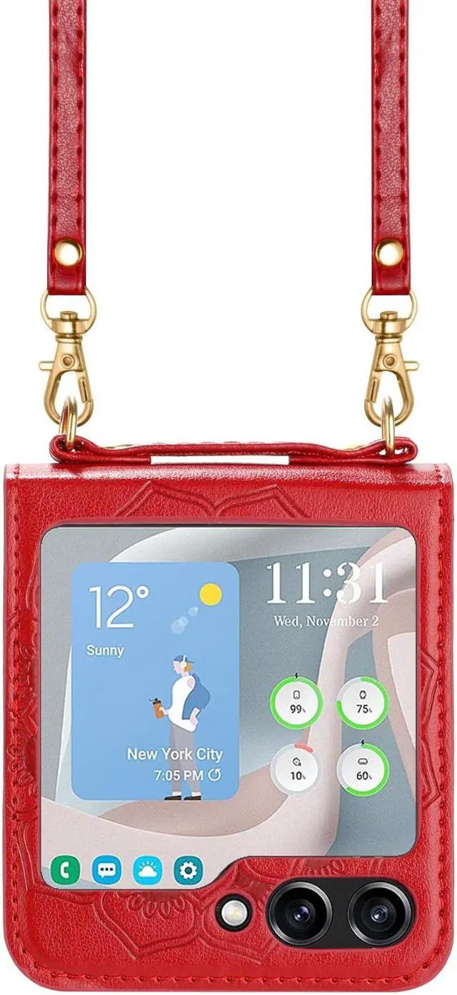 Features: Compatible with Samsung Galaxy Z Flip 5. The cover protects without being a bulky addition to your phone. It is designed with a slim form factor, keeping the sleek design of your phone intact. The embossed mandala flower pattern synthetic leather material is durable even against scratches so it stays safe in your pocket or purse with ease. Protect your phone's corners and exterior to keep it safe from damage. Add protection while maintaining Galaxy Z Flip5 5G's shape and the pocketable compact size. The thin material wraps around your phone and while enhancing the grip so your hands stay comfortable. Raised beveled edge offers front screen protection. The simple and easy installation allows the cover to be attached in no time. simply clip onto the top half and bottom half of the phone individually and away you go. Fully adjustable / detachable shoulder strap for a durable, comfortable and fantastic using experience. Features cut-outs for the ports and features including the charging connector and camera.