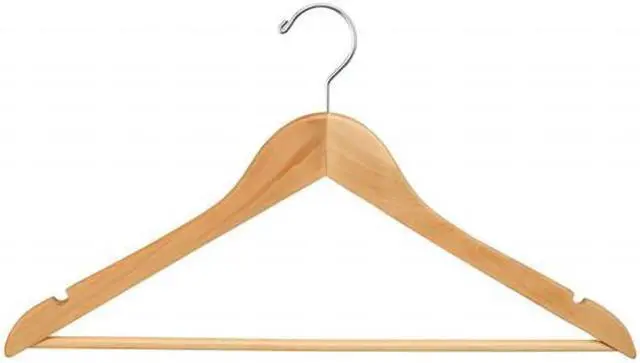 High quality, deluxe wood hangers are now available at incredibly low prices. Standard 17" wishbone hanger in attractive Natural finish with Chrome hook with wooden lock bar on spring. Hangers contain notches to accommodate garments with straps. Wishbonee hangers allow garments to retain their natural shape. Hangers can be printed with the retailers logo on them. We print In-House for fast turn around times. One time plate charge of $95. Minimum order 100 hangers. 300+ Hangers are $0.15 per hanger, pe