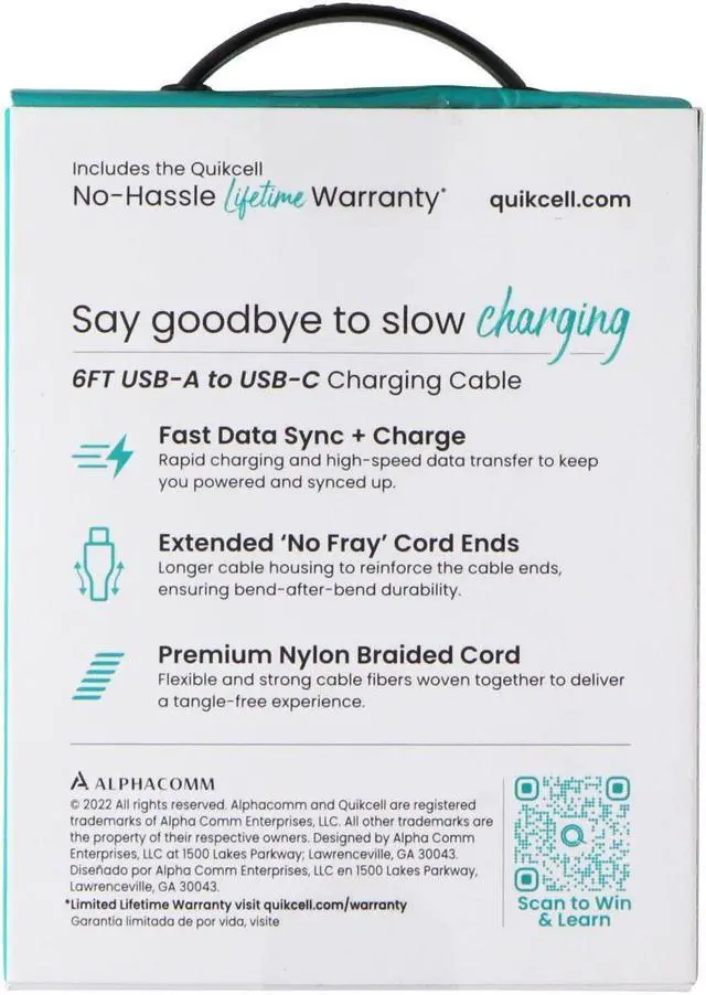The Quikcell 6ft Braided USB-A to USB-C Charging Cable. Black Unit Color. Features:Fast Data Sync + ChargeExtended "No Fray" Cord EndsPremium Nylon Braided Cord