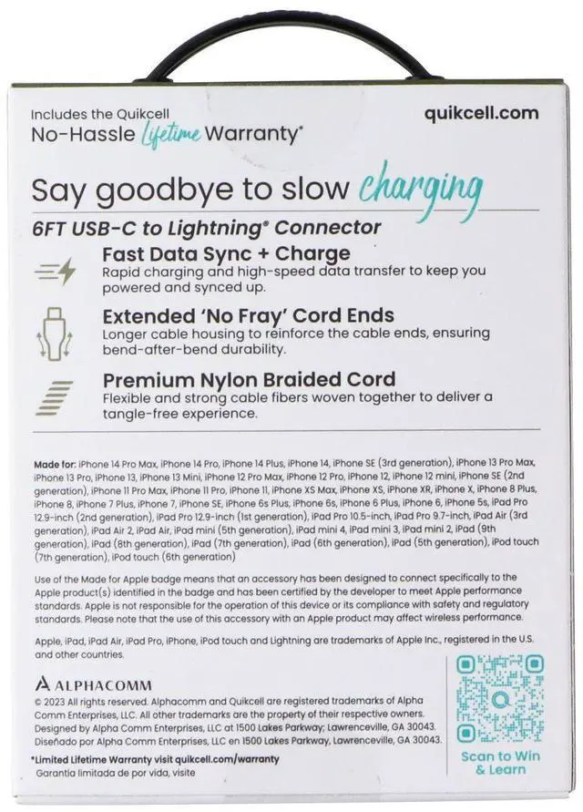 The Quikcell 6Ft Braided USB-C to 8-Pin Charging Cable. Black Version. Features:Fast Data Sync + ChargeExtended "No Fray" Cord EndsPremium Nylon Braided Cord