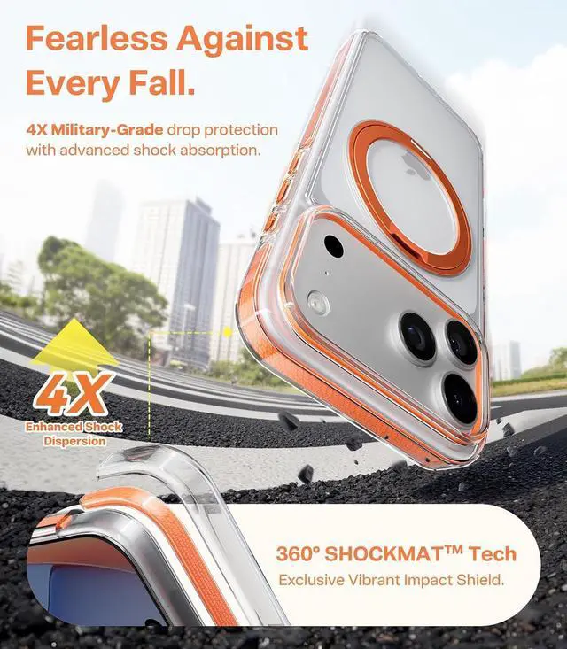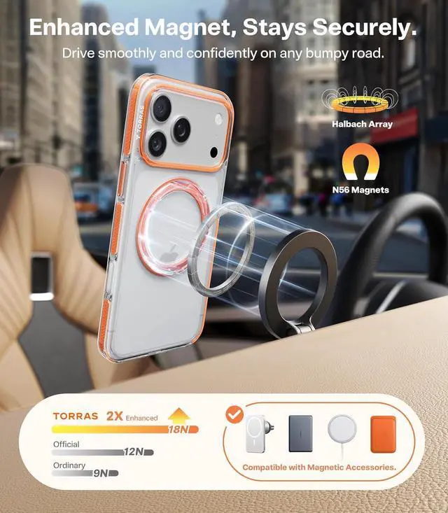 This is the magnetic case that finally delivers a perfect connection for Daily Magnetic Accessories so secure you'll forget it's even there. [4X Military-Grade Protection Lab-Tested for Stress-Free] Engineered for fearlessness the clear-orange case for iPhone 17 Pro Max features TORRAS exclusive Triple-Runway Air Cushioning with visible 360° SHOCKMAT impact absorption tech. Precision-raised bezels ( 1.5 mm screen 2.5 mm camera) shield against concrete strikes and tumbles all lab-tested to withstand over 30 000 drops from every angle. This premium protection empowers you to live boldly with zero stress. [The Palm-Hugging Grip All-Day Comfort] Say goodbye to hand fatigue.
