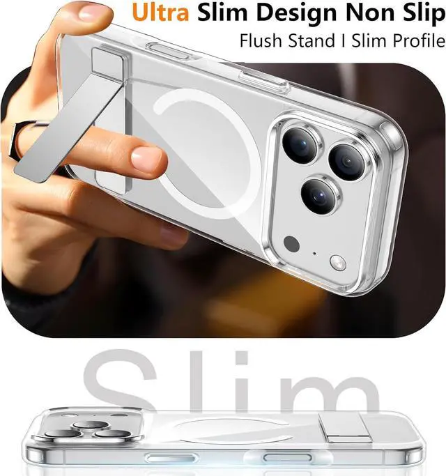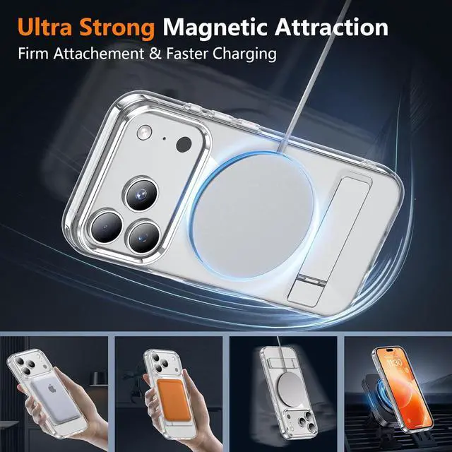 It allows you to get a more comfortable viewing angle. Reduce the frequency of looking down at the phone screen to avoid hurting your back and neck Only compatible with iPhone 17 pro max 6.9 [10FT Military-grade Shockproof ]Passed Military Drop Tested up to 10FT it has a tough PC brushed back and soft flexible rubber bumpers that provide strong cushioning for everyday drops. Built-in 360°all-around powerful impact-dispersing airbag and 4-corner impact-resistant corner technology. The tiny design of 1.5 mm lips over the camera and 1.5 mm bezels over the screen prevent the screen and camera from dust and scratches Only compatible with iPhone 17 pro max 6.9 [Crystal Clear & Non-Yellowing] This iPhone 17 pro max magnetic case using high-grade Bayer's ultra-clear TPU and PC material allowing you to admire the original sublime beauty of iPhone while won't get oily when used Only compatible with iPhone 17 pro max 6.9