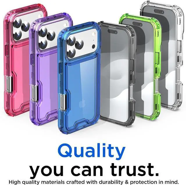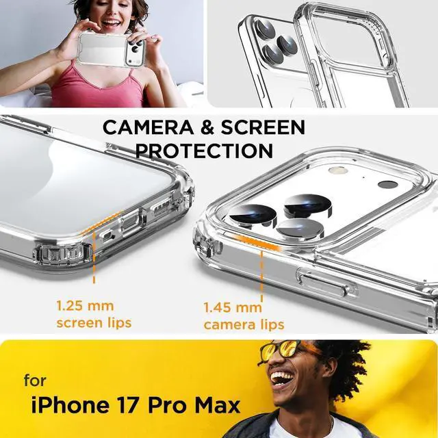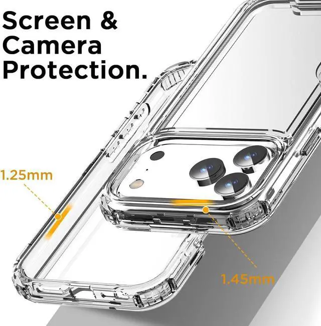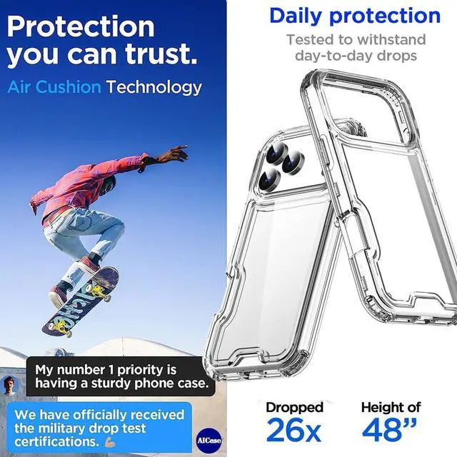 Fit]: AICase are committed to providing users with unique tough protection phone cases special designed for iphone 17 Pro Max( 6.9 -inch) providing you a brand-new experience of iphone 17 Pro Max case this case has cut outs to perfectly fit the buttons speakers and the charger. It also features a raised camera ring to keep lenses protected. 360° Full ProtectionDROP+ 5X as many drops as military standard (MIL-STD-810G 516.6 ) and features a 3-piece design to keep phone securely in place and protected. The Clear case supports seamless use with most wireless chargers blending high protection with modern tech compatibility. Military Standard Drop ProtectionThis phone case designed for the iphone 17 Pro Max features a 3-layer protective frame with upgraded X-SHOCK airbags at the corners. 3-layer cushioned bumper and hard back panel to reduce drop impact by more than 96%. It has passed the (MIL-STD 810G- 516.6 ) drop test keeping your phone intact even if it is dropped on concreteCamera & Screen Scratch ResistantThis iphone 17 Pro Max case offers a 2.5 mm camera protection lip and a 1.5 mm screen lip to prevent scratches from direct surface contact. These tiny designs ensure that your phone's screen is always flawless taking pictures with ultra-clear pixels.