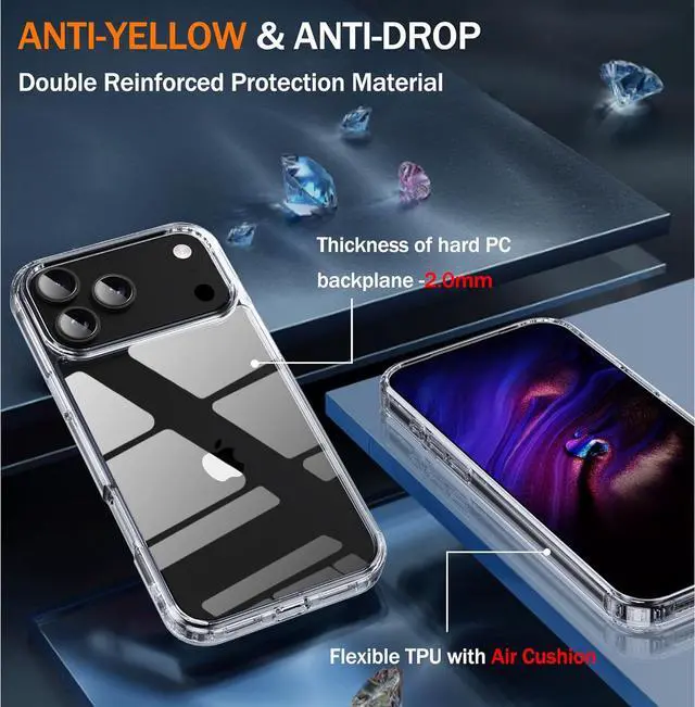 CompatibilityOnly compatible with iPhone 17 Pro Max; precise cutouts for easy access to all ports buttons sensors and cameras soft and sensitive buttons with good response are easy to pressCrystal ClearThis anti-fingerprint dust-resistant non-marking transparent slim phone cover case for seamlessly wraps around your phone ensuring that your phone stays clean and clearFull ProtectionClear basic back cover's tough acrylic back panel and slightly raised TPU bezel protects the screen camera and phone body from scratches drops shocks and daily wear and tear keeping your phone looking as good as newAnti-Yellowingphone case is made of highly transparent and oxidation-resistant TPU material which keeps it shiny and glossy and showcases the original beautiful design and colors of PhoneQuality AssuranceWe offer a 30-day warranty.