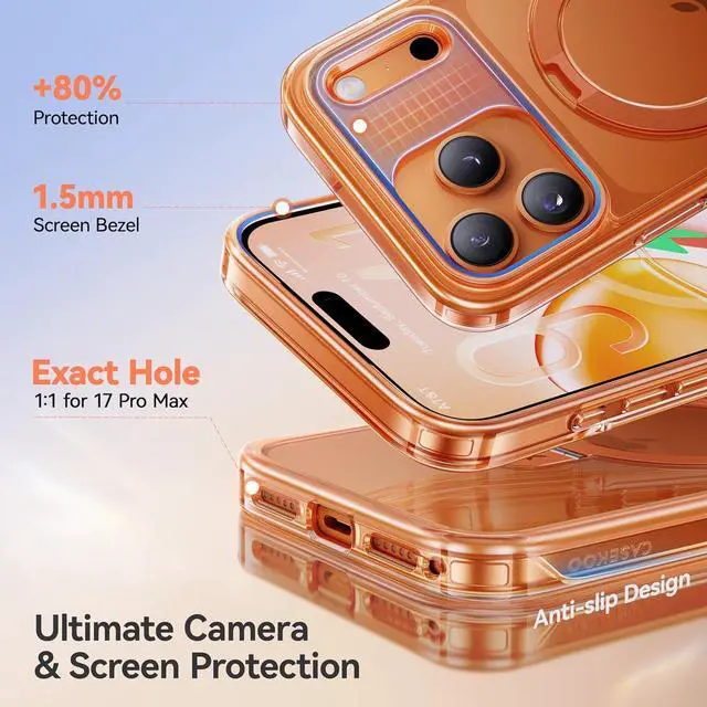 Designed to Match Official Cosmic OrangeSoft clear coating wraps a orange frame using advanced spray-tech no scratches no fading just lasting shine for your iPhone 17 Pro Max. Matching edges lens ring and kickstand bring sleek harmony while the anti-yellowing crystal-clear back highlights your phones original beauty. Where simplicity meets thoughtful design. iF Design Award Winner - Invisible StandDesigned for iPhone 17 Pro Max this CASEKOO exclusive case features a patented invisible stand ring made from aerospace-grade aluminum. Its lightweight yet durable serving as a secure grip stable stand magnetic mount and wireless charging helper.