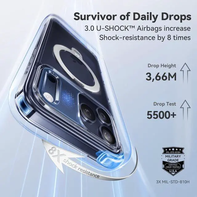 Place it in landscape mode for watching movies which is adjustable to prevent screen glare. 180-Day WarrantyUpgraded N58 Magnets Fit With MagSafeEmbedded N58 neodymium permanent magnets and MagPrime patented tech designed for iPhone 17 Pro Max Case ensures 4x stronger magnetism and 25W fast wireless charging. 17FT Military Grade ProtectionAdvanced TPU material with 3.0 U-SHOCK Airbags for shockproof protection tested for drops up to 17 feet. Raised 2.5 mm camera edges and 1.5 mm screen edges protect the camera. 6.00 cm2 area cover effectively prevent scratching. Anti Slip Design and Easy to CleanAnti-slip concave-convex patterns offer a secure grip.