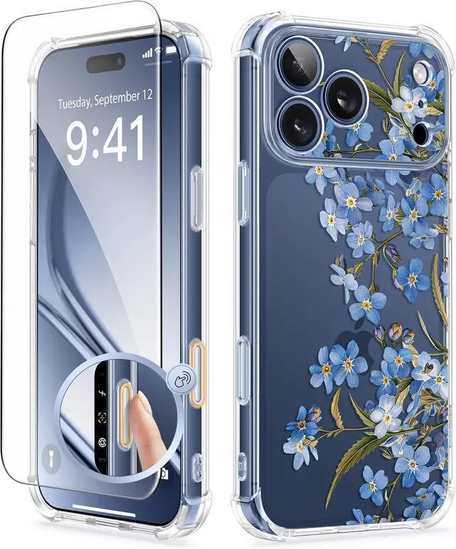 • GVIEWIN for iPhone 17 Pro Max Case [Upgraded Full Camera Protection][Not Yellowing][Screen Protector] Shockproof Protective Clear Floral Phone Case for iPhone 17 Pro Max 6.9 (Aconite/Blue)
