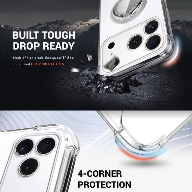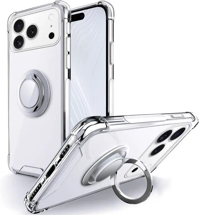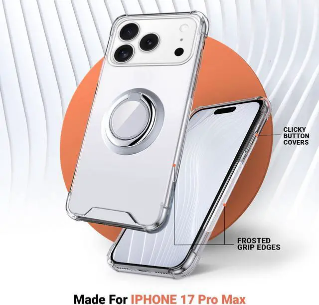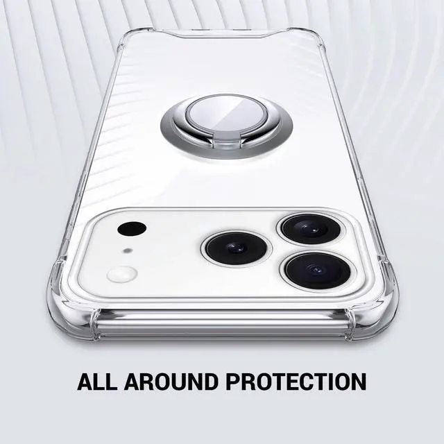 Designed for iPhone 17 Pro Max - Precise cutouts for speakers charging ports audio ports and buttons for your convenience. EASY CARRY RING STAND HOLDER - Case includes a full 360 Degree rotating ring kickstand that allows for multiple holding positions and convenient sidestand viewing. Ring center is magnetic making it perfectly compatible with magnet mounts. SUPER SOFT AIR CUSHION DESIGN - Designed with safety and security in mind our case has full corner and button protection with air cushioned soft TPU. Great protection from falls and drops. CRYSTAL DESIGN -This clear case shows the original color of your phone keep your phone in natural look with raised lips around screen and camera.