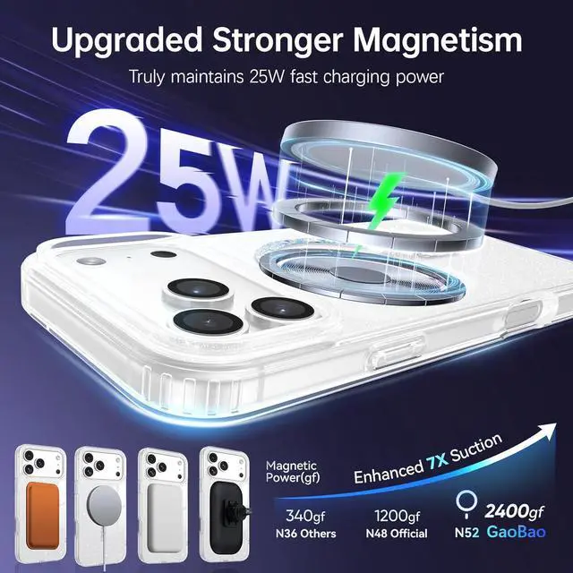Stronger Magnetic Lockcase iphone 17 pro max has powerful built-in N52 magnets magnetic attraction reaches 2400 gf which is almost 7X stronger than ordinary aligns perfectly with all Mag Safe accessories and QI-certified wireless chargers wallet battery pack magnetic car mounts etc. offers a strong attach experience and faster wireless charging. 16FT Military Grade Drop Protectionphone case iphone 17 pro max is made with a shock-absorbing TPU and scratch-resistant PC backplane effectively protecting your phone from accidental drops and bumps. The raised edges of the screen and camera offer better protection against scratches. Precise Cutoutsiphone 17 pro max case clear with accurate and precise ports marry up to the all buttons speakers volume controls and camera perfectly allow easy access to all the functions of your phone.